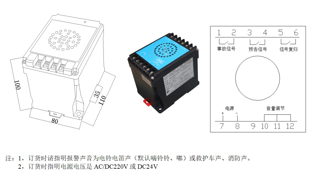 音量調(diào)節(jié):報(bào)警器默認(rèn)低音量,端子10-11-12三個(gè)端子為音量調(diào)節(jié)端子,10-11短接中音量,10-12短接高音量,不短接為低音量。