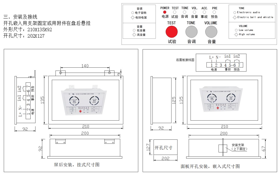 指示燈:電源(紅色),事故信號(紅色),預(yù)告信號(綠色)